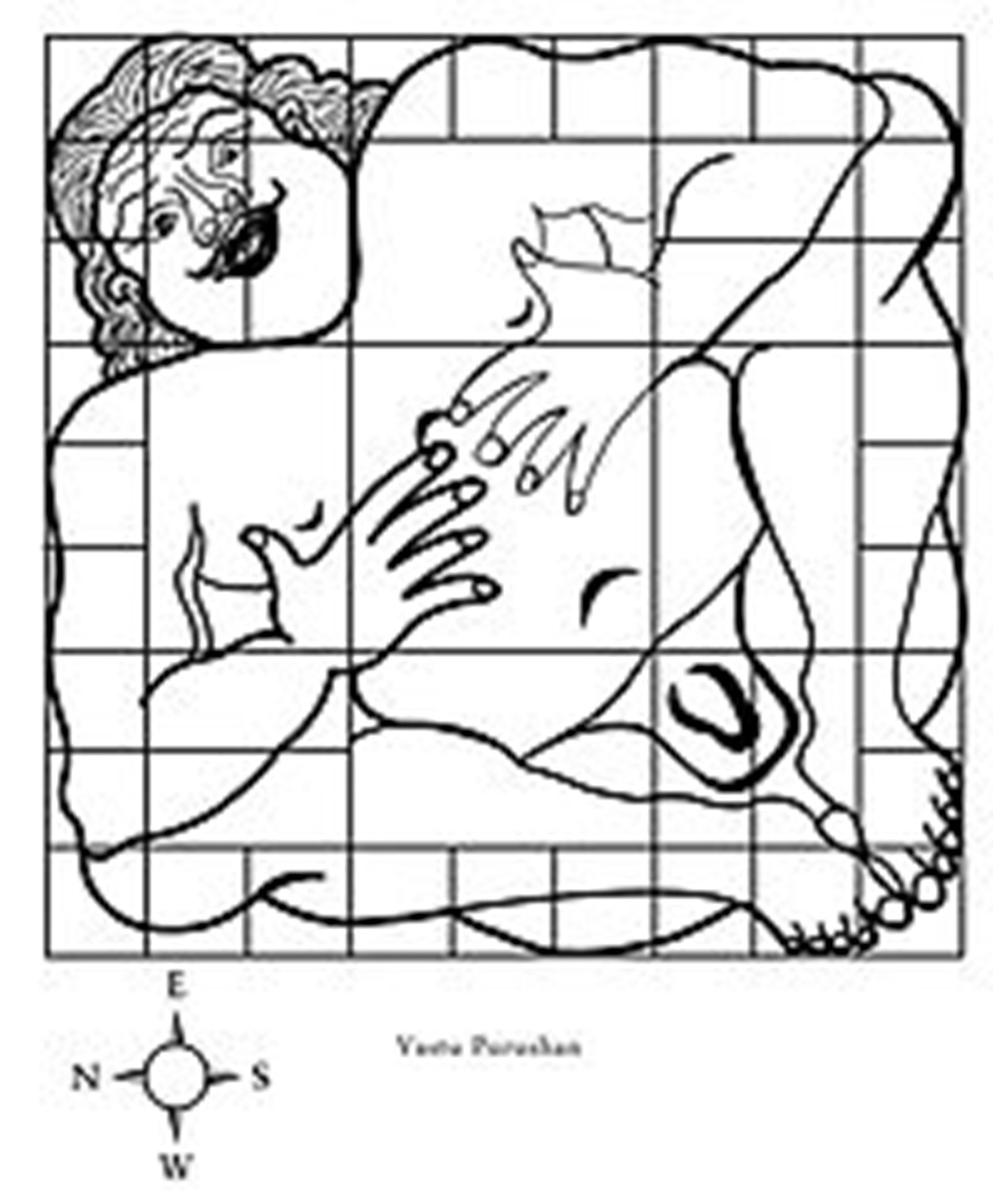 The Vastu Purusha is the presiding deity of any site. Usually he is depicted as lying on it with the head in the northeast and legs in the southwest but he keeps changing position throughout the year.